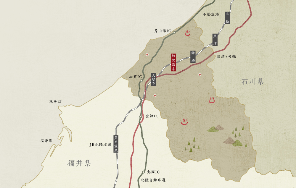 - 加賀温泉駅から車で約22分(距離・約15km)